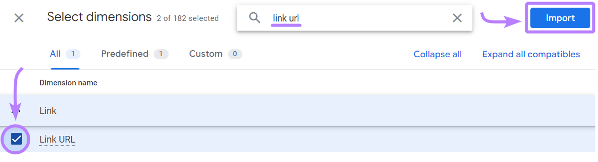 You’ll now search for the two dimensions you need for the link click report. First, search for "Event name" and toggle it on.